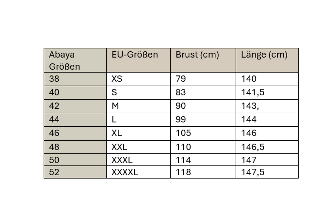 Bitte beachte die Größentabelle, da die Größen den Abaya von der Standard EU-Größen abweichen.